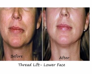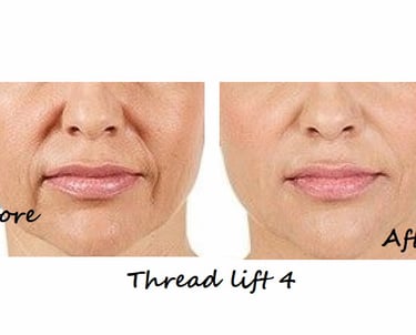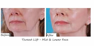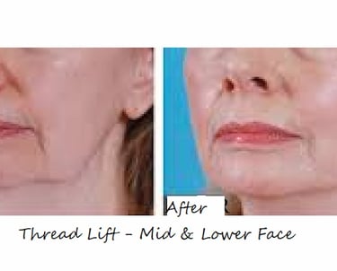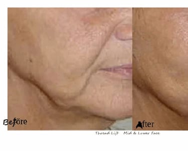 After: shows the result after 2 months of treatment. She had thread lifts in mid & lower face. Notice accompanying skin tightening, younger & slimmer look, better defined facial features like jaws, cheeks.