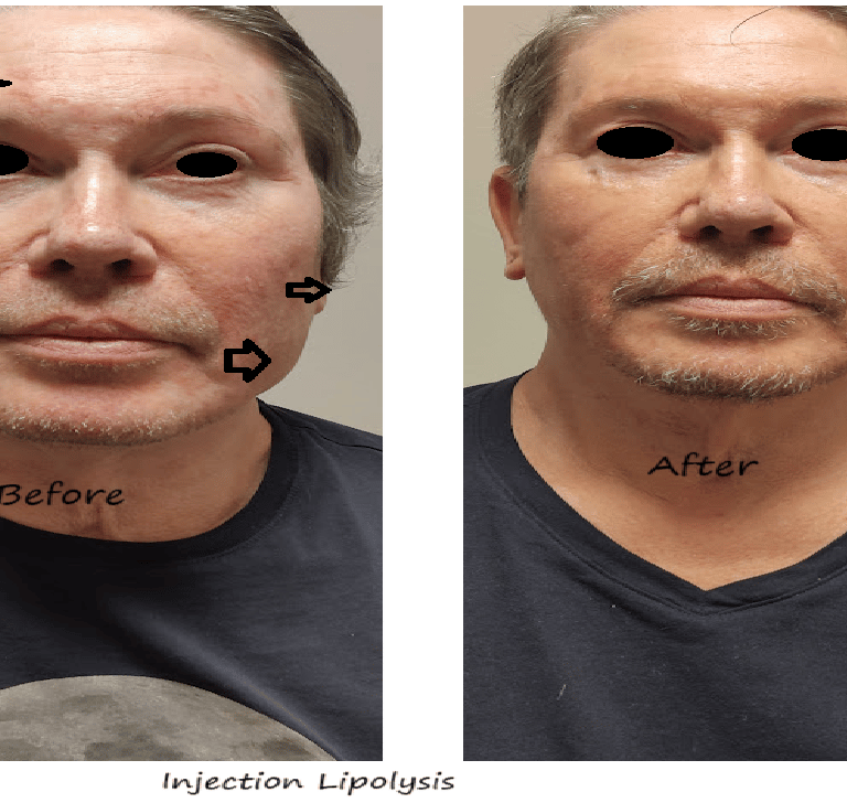 After: shows the result after 6 weeks and 2 sessions of injection lipolysis. No adverse effects. Notice accompanying skin tightening, no scars. The excess skin sagging seen in other types of fat reduction is absent in inj. Lipolysis
