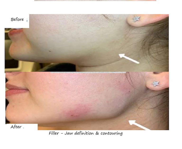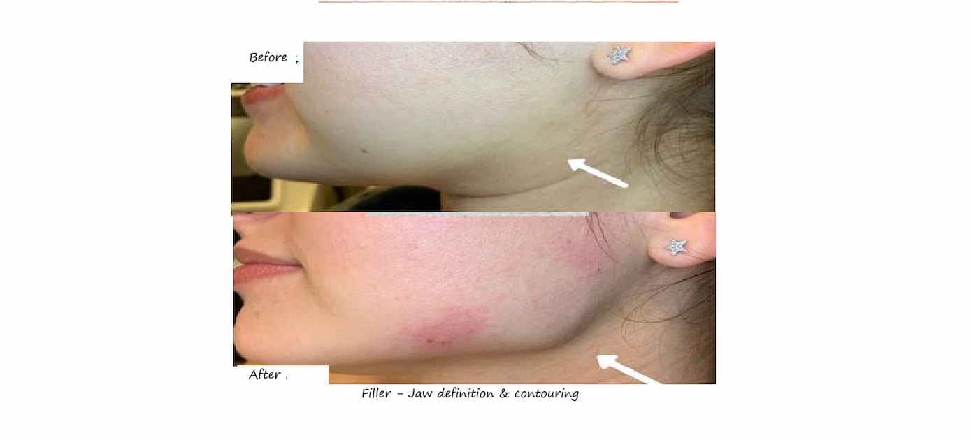 After: shows the result immediately after filler treatment. There is now clear demarcation between the face & the neck, making the face look much smaller and attractive. Here filler is used to define the jaw.